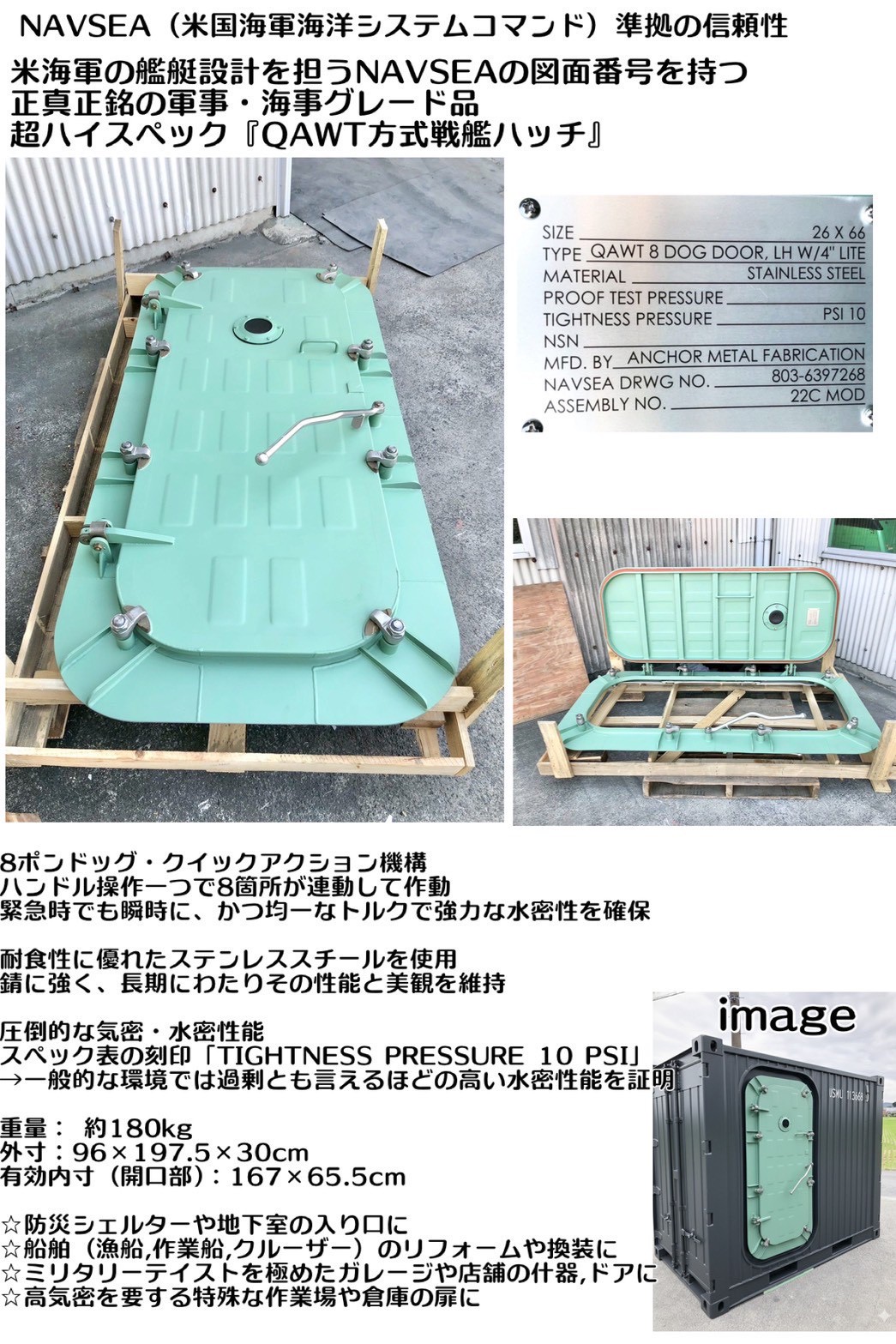 米海軍 NAVSEA規格 QAWT 水密ハッチ ステンレス製 艦艇ドア