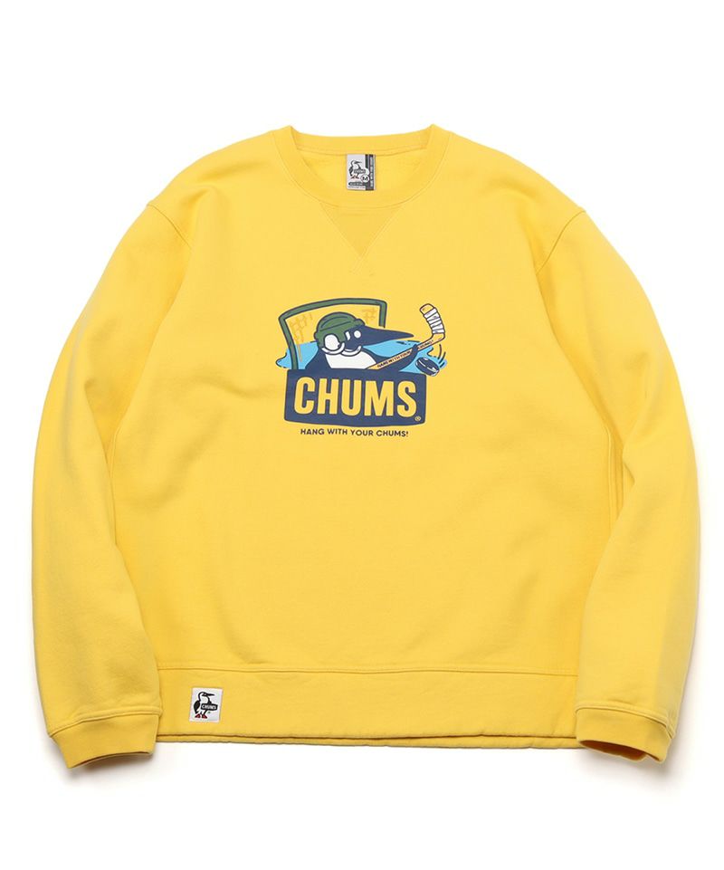 定番のブービーフェイスロゴをアレンジしたクルーネックスウェット。身幅はゆったりとしたボックスシルエット。裾と袖口にリブを施し、一枚でさらっと着ても成立するバランスの良いシルエットに仕上げました。フロントにはヘルメットをかぶってアイスホッケーを楽しんでいるブービーをプリント。手元のスティックには袖にはCHUMSの合言葉「HANG WITH YOUR CHUMS」を綴り、ゴール編みには刺しゅうを施しました。