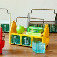 ダイニングテーブルやデスク傍に置いて、調味料や小物をまとめておけるオーガナイザー。 3つのガラス容器、トップトレイ、サイドポケットと3タイプの収納スペースで構成されており、角砂糖やクリップなどの細かなものから、調味料やグラス、ペンやハサミなどの様々な形状の小物を収納できます。 頑丈なスチールの枠組みと分厚く青みがかったガラス容器の組み合わせは、クラシカルでありながら新鮮な存在感も。 これを置くために中に入れる小物を用意したい、そんな衝動買いも大歓迎のアイテムです。