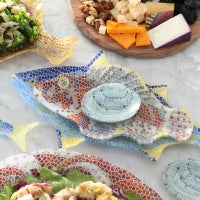 地中海をイメージした魚介類たちが描かれた、遊び心とユーモアに溢れるガラスプレート。爽やかな色彩とモザイク調のデザインは、太陽の光を浴びて輝く魚たちのよう。料理を盛り付ける以外にも、壁掛けなどのインテリアとして使用しても◎他にも、アクセサリーや小物などを置いたり使い方はあなた次第です。