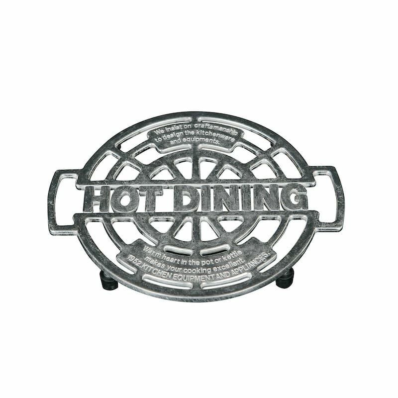マンホールの蓋を思わせるデザインが、スタイリッシュなトリベット。アルミ製なので堅牢で軽く、使い込んで付いたキズも良い味わいとなるアイテムです。また、使わない時はプレートとして置くだけでも絵になる優れモノ。使い易いサイズと、滑り止めが付いた脚部も嬉しいポイントです。
