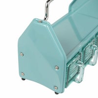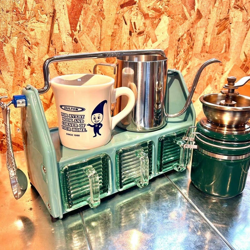 ダイニングテーブルやデスク傍に置いて、調味料や小物をまとめておけるオーガナイザー。 3つのガラス容器、トップトレイ、サイドポケットと3タイプの収納スペースで構成されており、角砂糖やクリップなどの細かなものから、調味料やグラス、ペンやハサミなどの様々な形状の小物を収納できます。 頑丈なスチールの枠組みと分厚く青みがかったガラス容器の組み合わせは、クラシカルでありながら新鮮な存在感も。 これを置くために中に入れる小物を用意したい、そんな衝動買いも大歓迎のアイテムです。