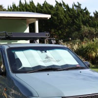 広げてフロントガラスにあてがい、両サイド(運転席/助手席)のサンバイザーで固定してください。