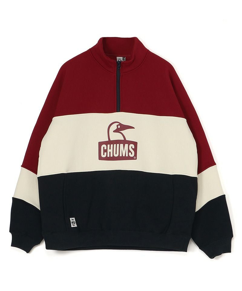 90年代のスポーツウェアからインスパイアされたパネル切り替えのデザインを落とし込んだハーフジップトップ。全体的にゆったりしたオーバーサイズ。襟部は立ち襟と倒しの2通りの着こなしができ、ジップを開けてカットソーやシャツとレイヤードもオススメ。